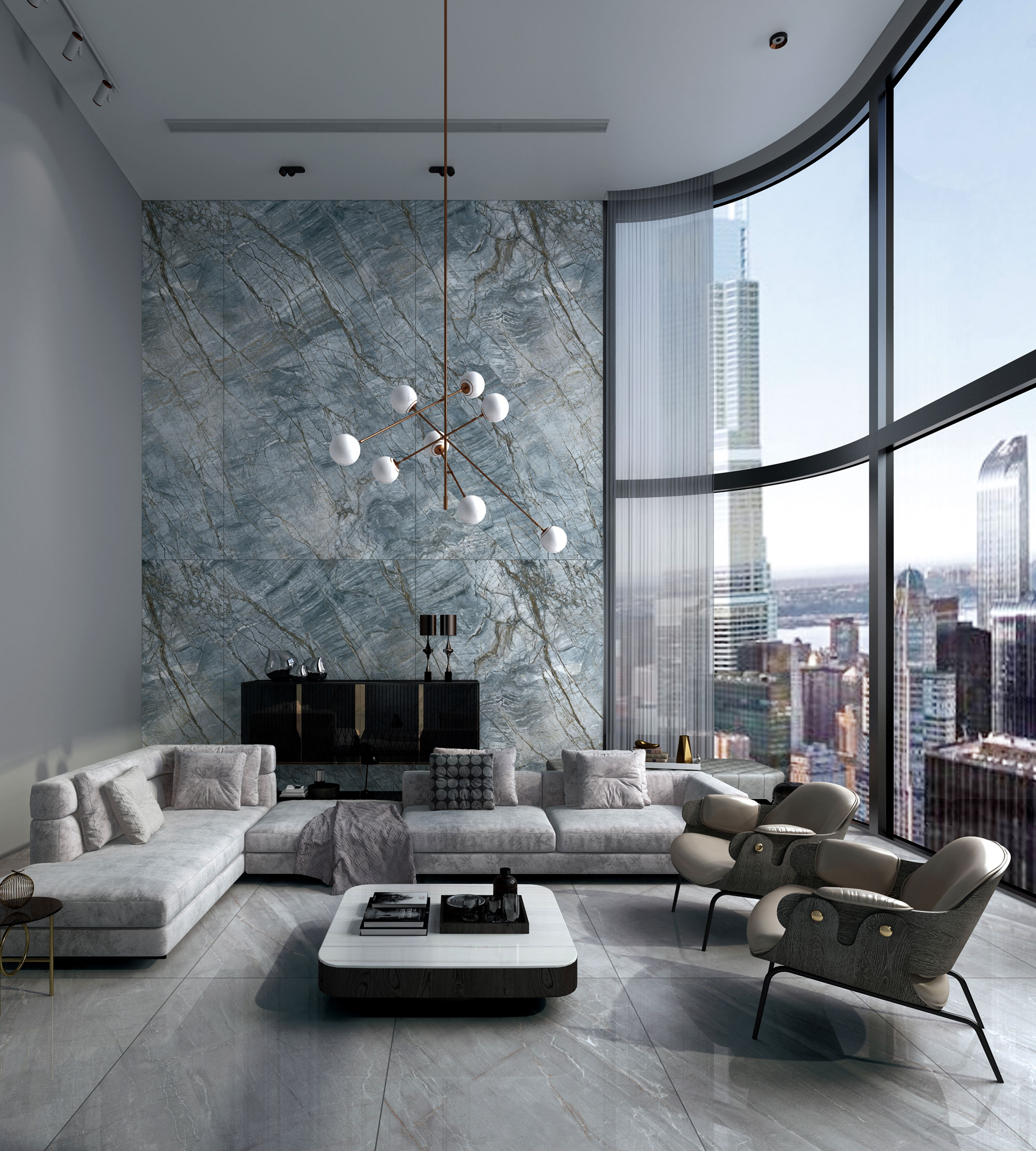 從北大西洋中脊澄凈空明的瓦塔納冰川汲取靈感,集合了冰川的色澤和紋理,還原冷冽氣息的圣山水晶,像是把水下根脈和冰河湖,一針一線地縫進(jìn)巖板上。清冷的紋理色彩猶如生命般堅(jiān)毅,斑駁交錯(cuò)的根脈散紋在平面盛開。親近其中,如同一道天然的灰藍(lán)色屏障縈繞在側(cè),連呼吸都前所未有的暢快。